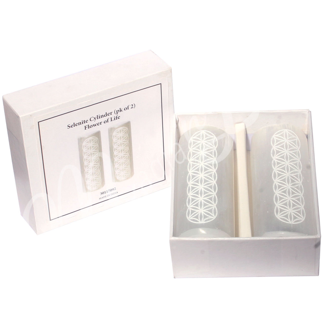 Both cylinder are made of Selenite and measure 1.5" in diameter X 4" in height. They come in a gift box.
