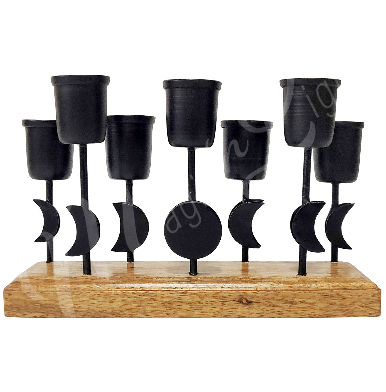 An iron moon phase mini candle holder on wooden base, designed to hold seven candles.