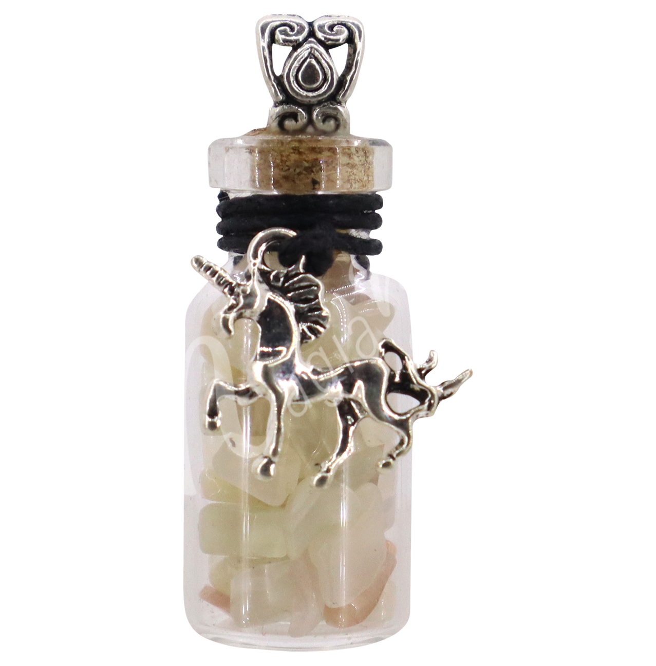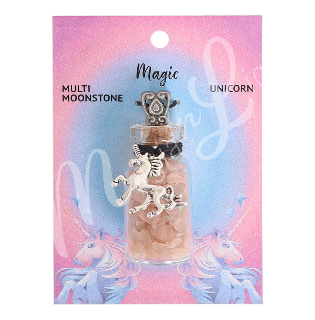 Multi Moonstone connects to the moon. The bottle has an Unicorn charm on it.