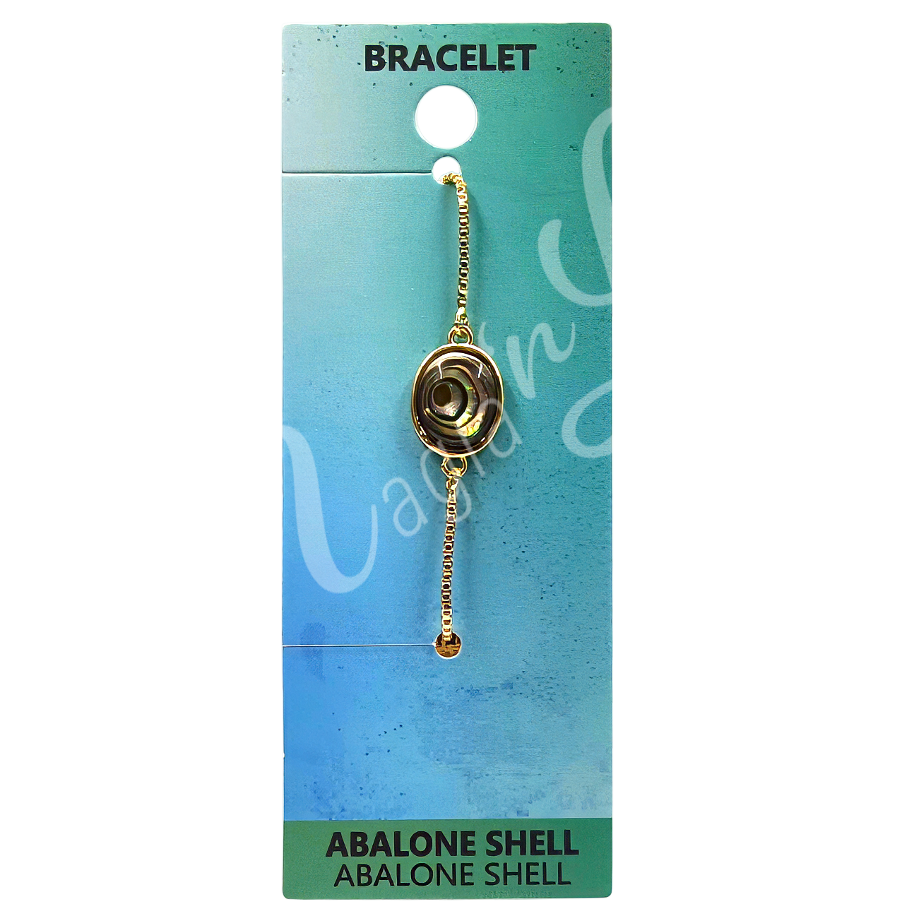 This elegant adjustable gold-tone slider bracelet features a delicate chain and a round bezel-set iridescent abalone shell centerpiece that reflects subtle rainbow hues with every movement. Finished with a smooth pull-tie closure for a customizable fit, it offers effortless wearability and modern elegance. The luminous focal stone adds a unique, eye-catching touch, making this bracelet perfect worn alone or layered for a refined, contemporary look.