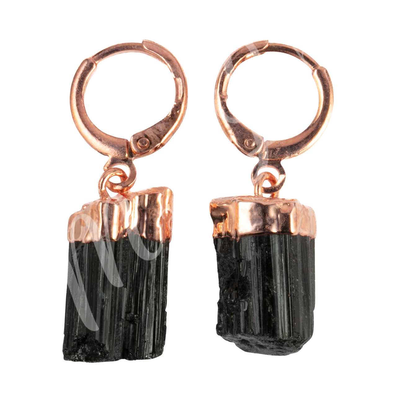 The earrings are made of black tourmaline with rose gold-plated brass hoops.