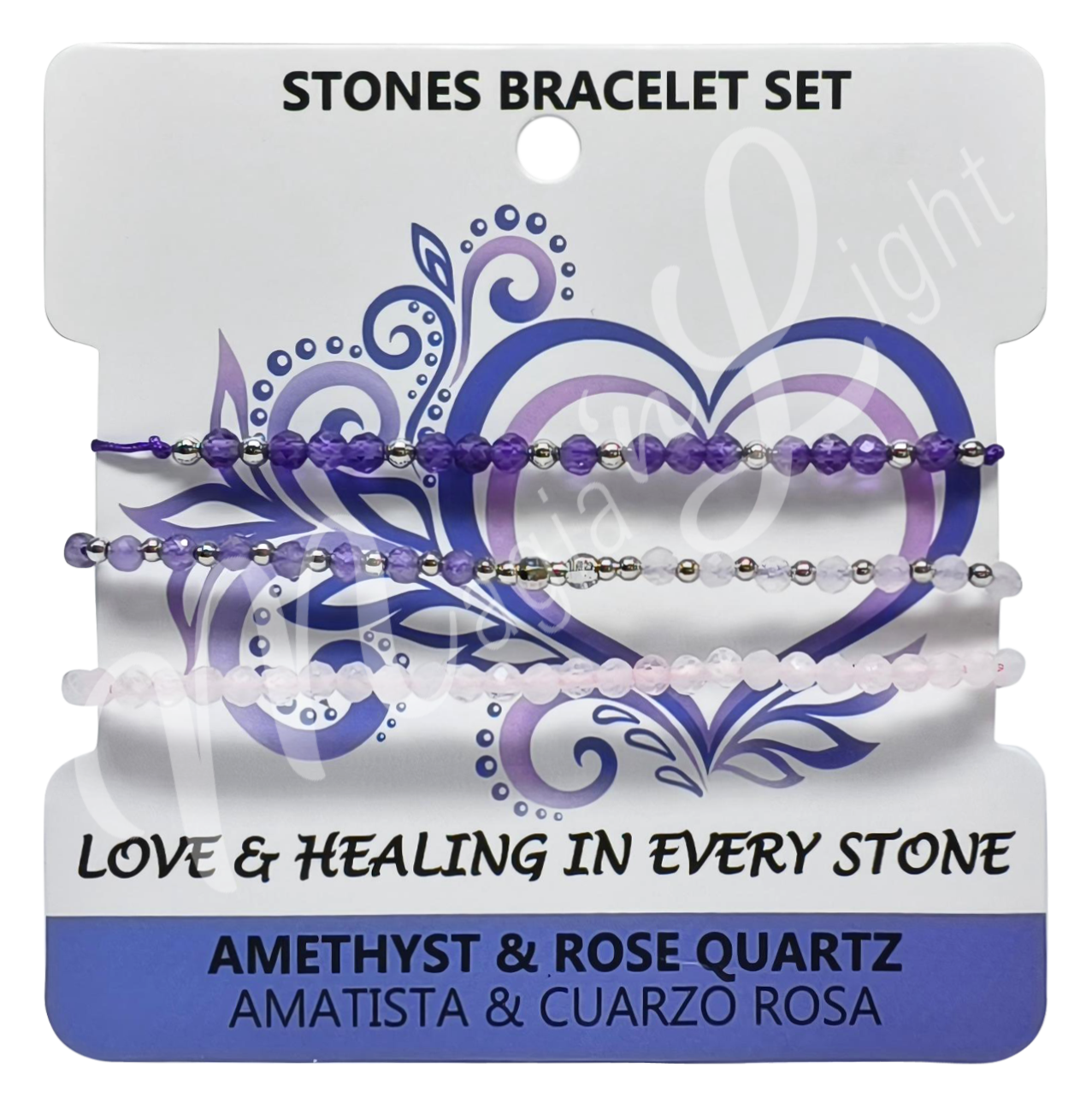 Amethyst is a stone of healing and spiritual protection. Rose Quartz embodies love in all forms: love for yourself, for others, for the Earth, the Universe, and the Divine.