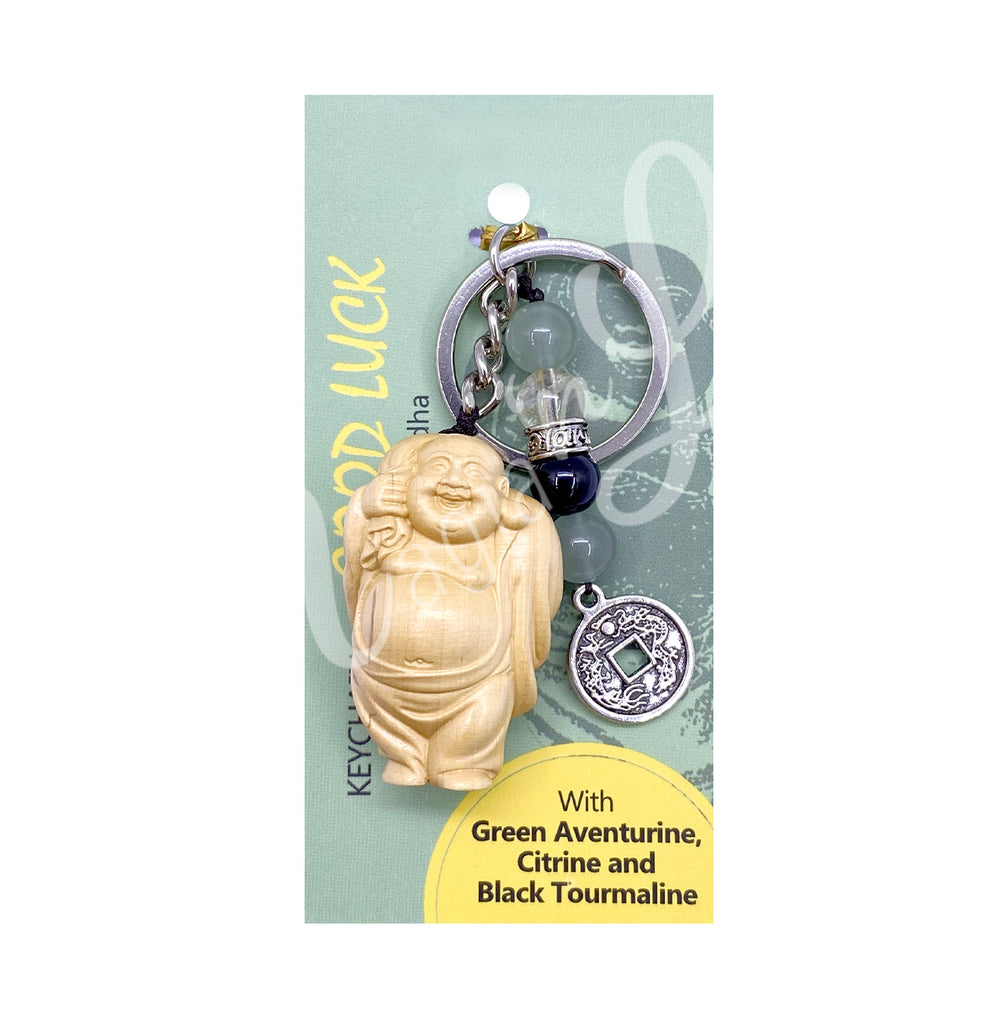 Este llavero está elaborado con cuentas de piedra de aventurina verde, citrino y turmalina negra. La talla del Buda está hecha de madera. El tamaño del Buda feliz es de 39 X 25 X 20 mm.