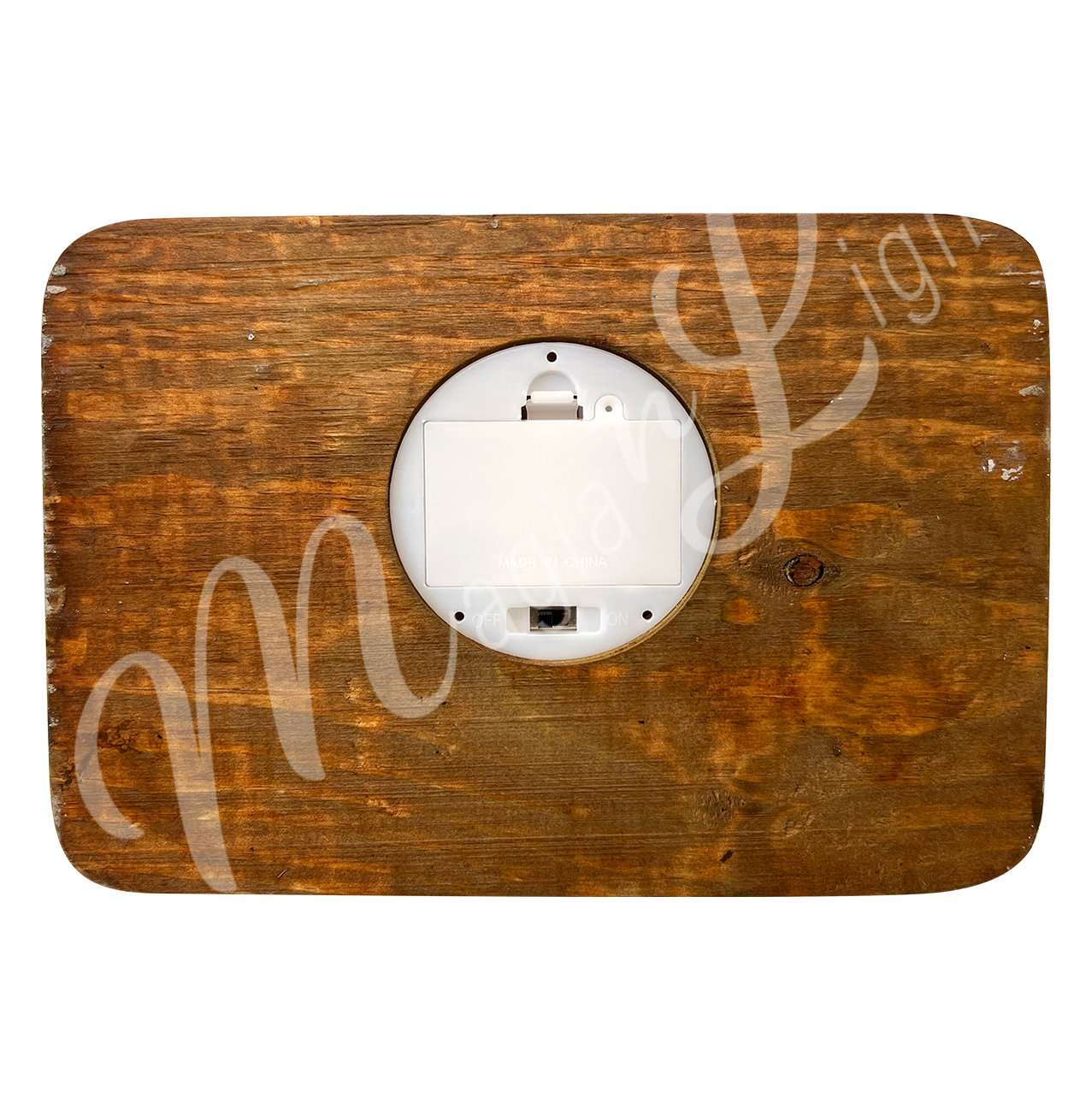 Seen from under the rectangular wooden base, you can see the battery compartment and the on/off switch.