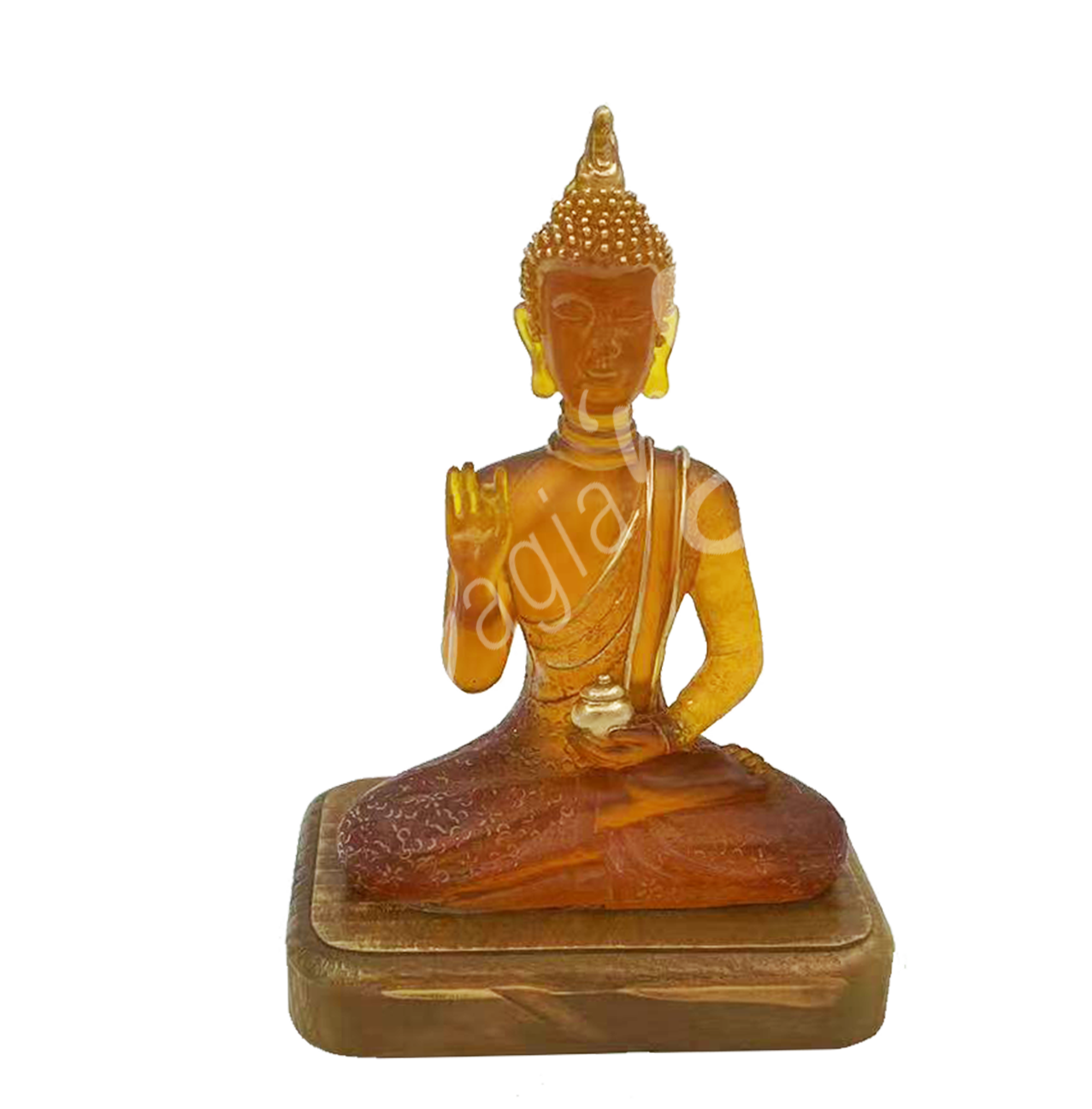 This statue is made from amber resin and represents Buddha with a raised hand