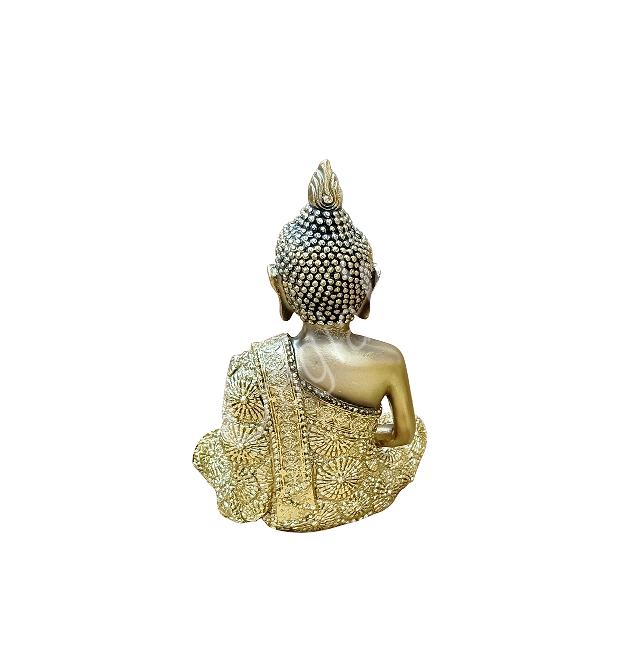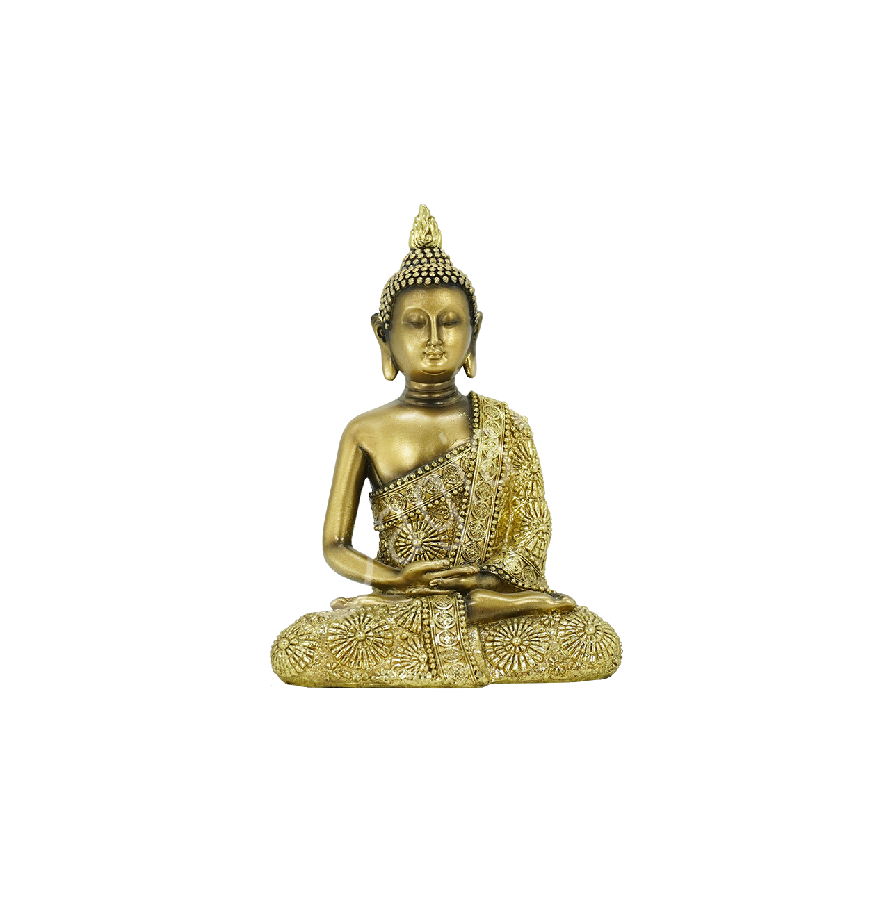 This Statue is made from gold-colored resin and represents a Buddha. It measures 4.35″L X 6.3″H.