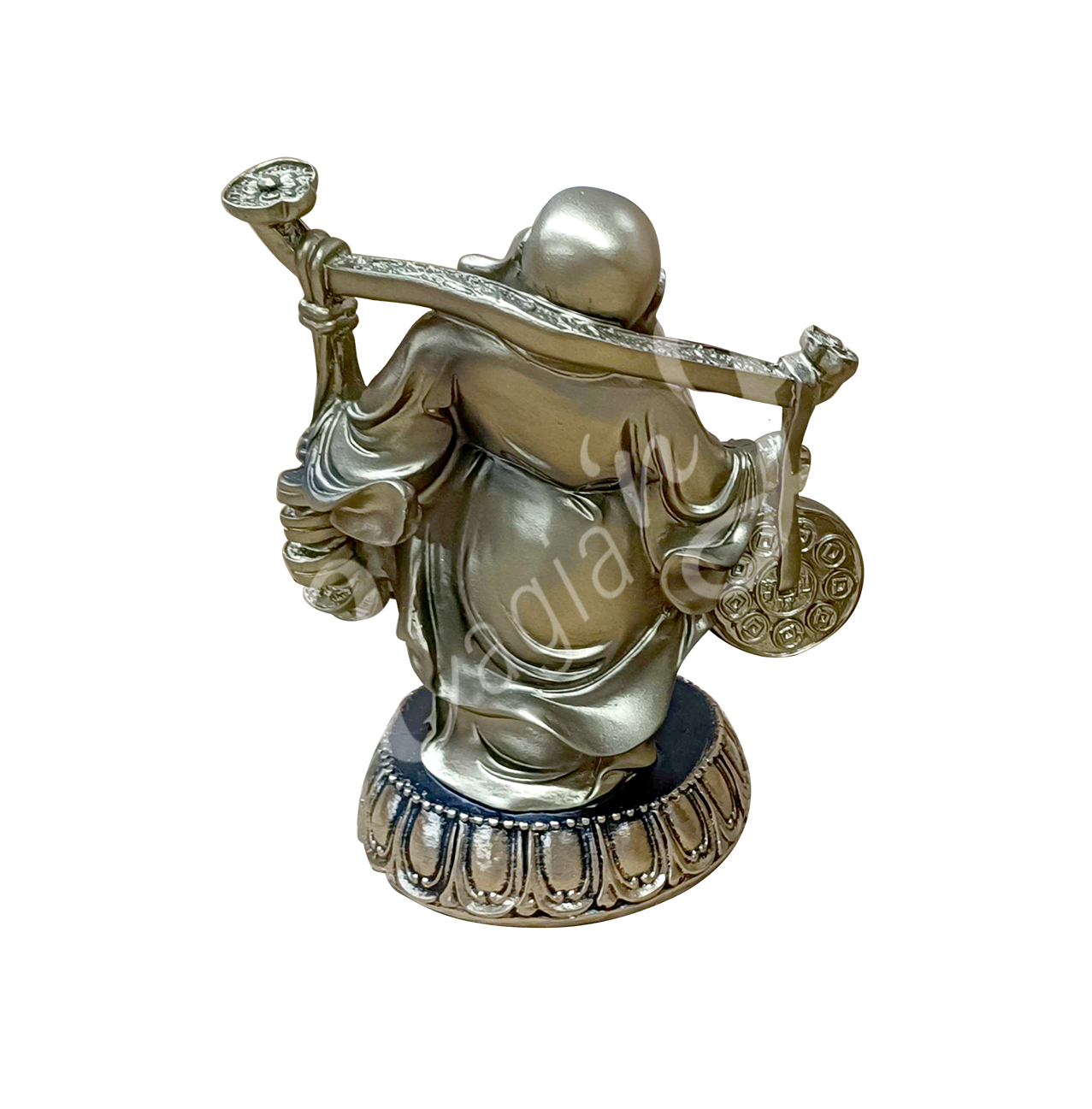 A gold-colored resin statue featuring a happy Buddha carrying coins, seen from the back.