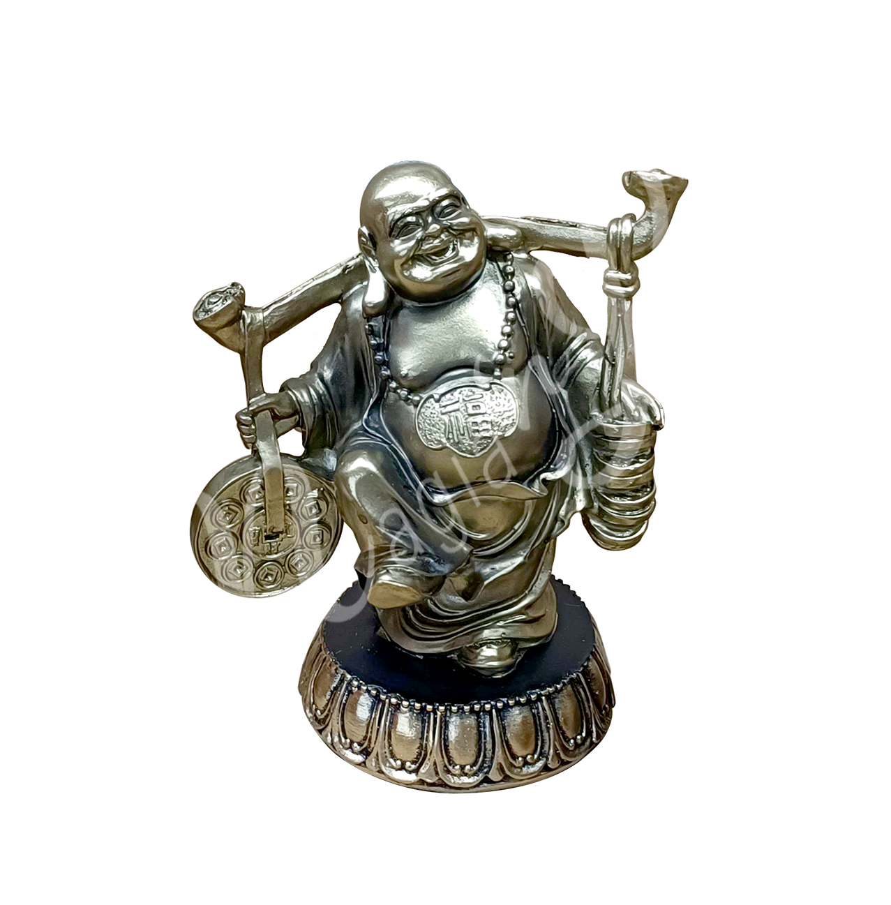 The Happy Buddha carrying coins symbolizes abundance, prosperity, and the joyful attraction of wealth and good fortune.