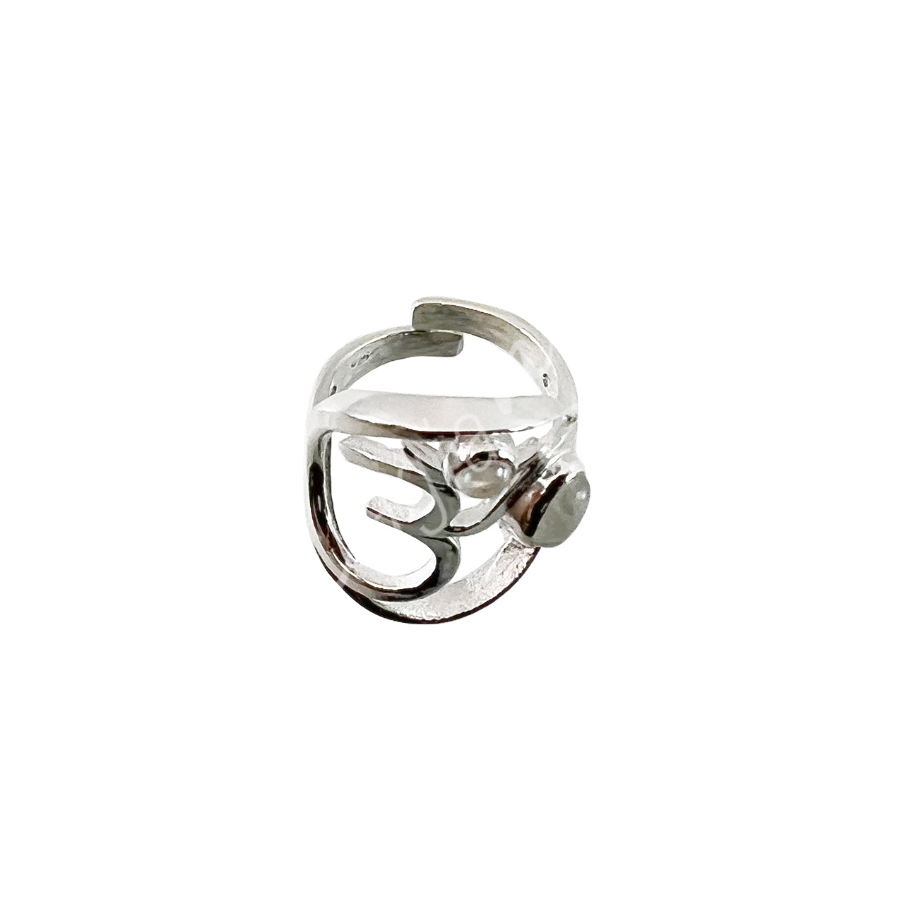 This adjustable ring is shaped into a OM design and is adorned with Rainbow Moonstone.
