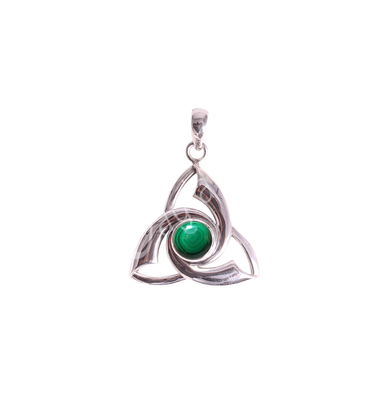 This pendant is shaped into a Triquetra and adorned with Malachite.